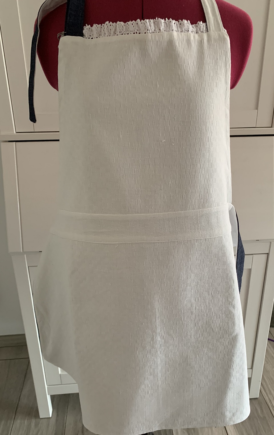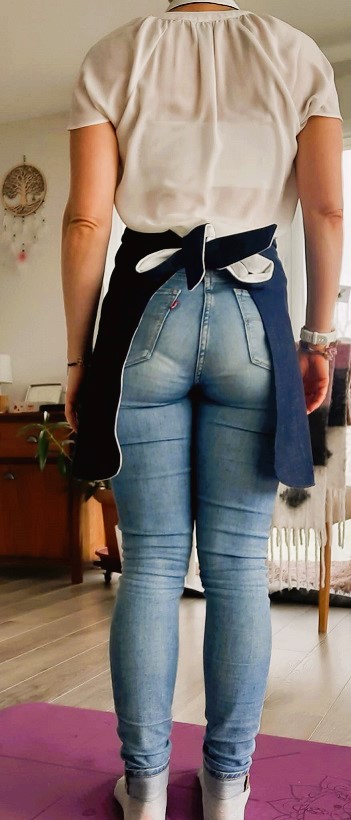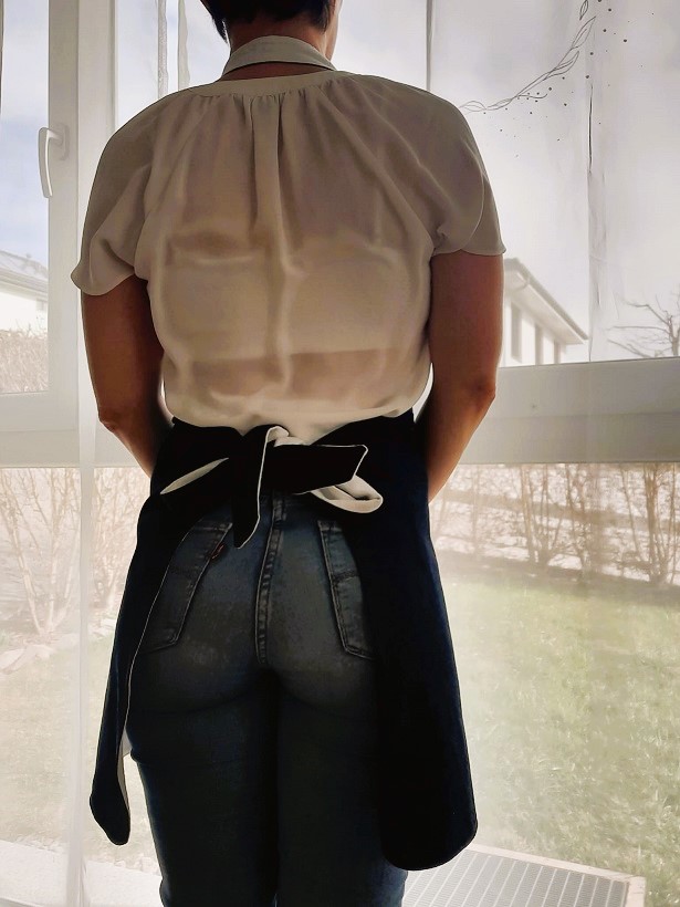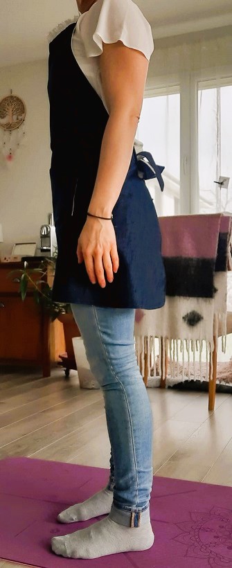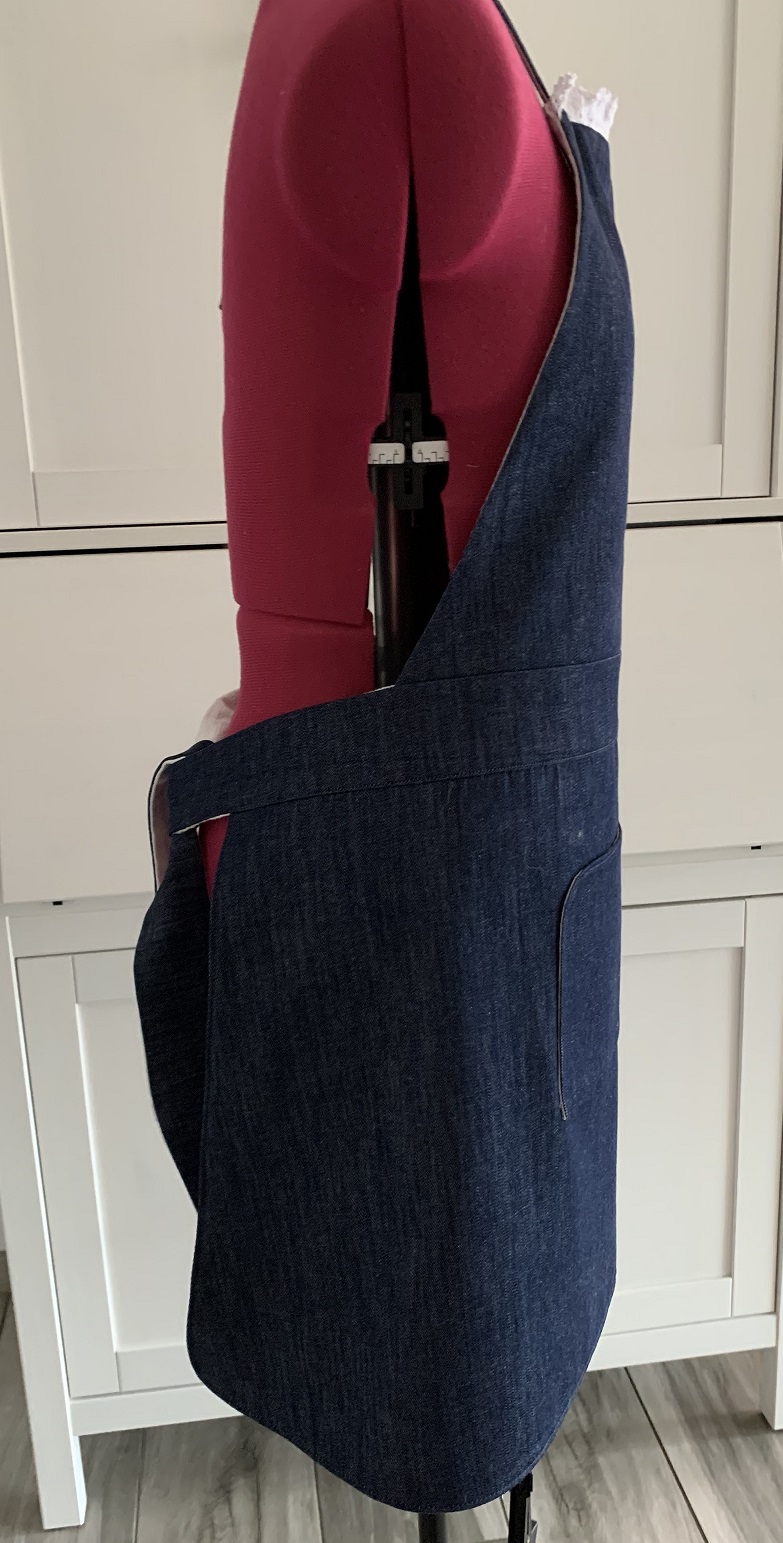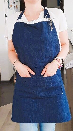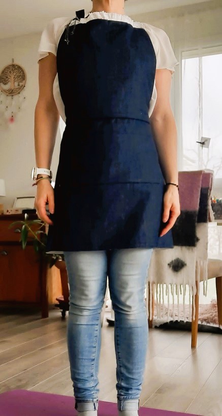 Et voilà ! Après quelques heures de galère et j’ai enfin réussi à coudre ce tablier à temps pour l’offrir à mon amie. Le voici sur le mannequin puis porté pour de vrai :