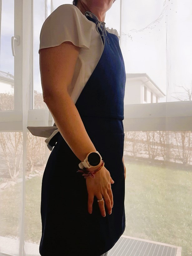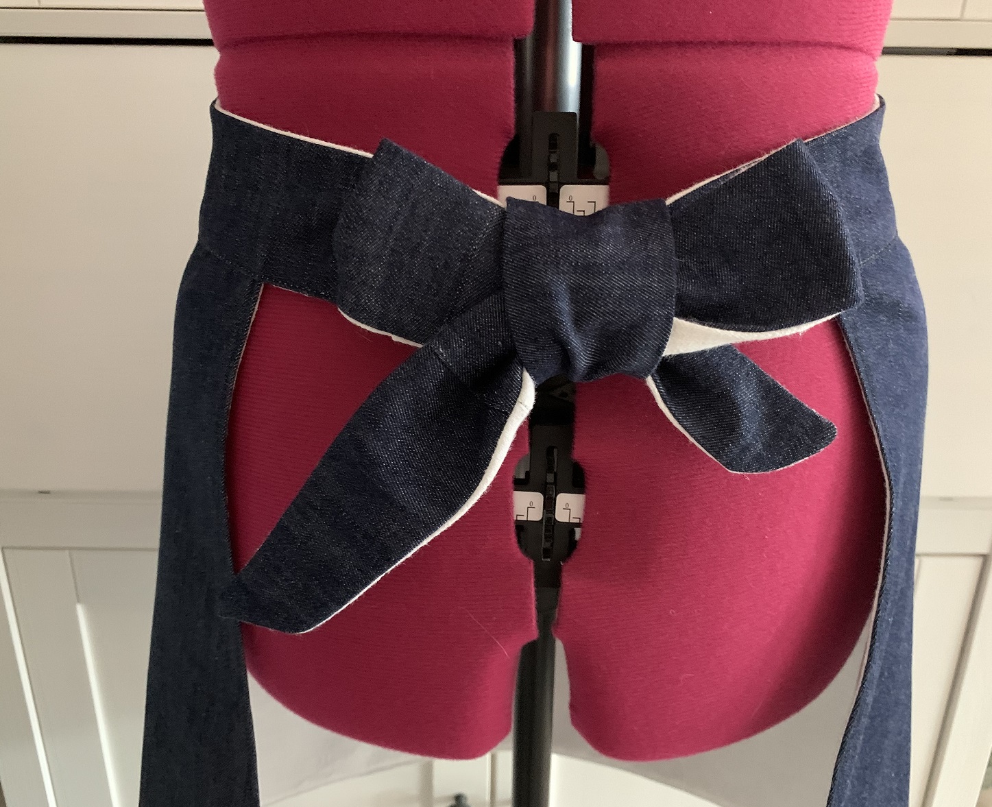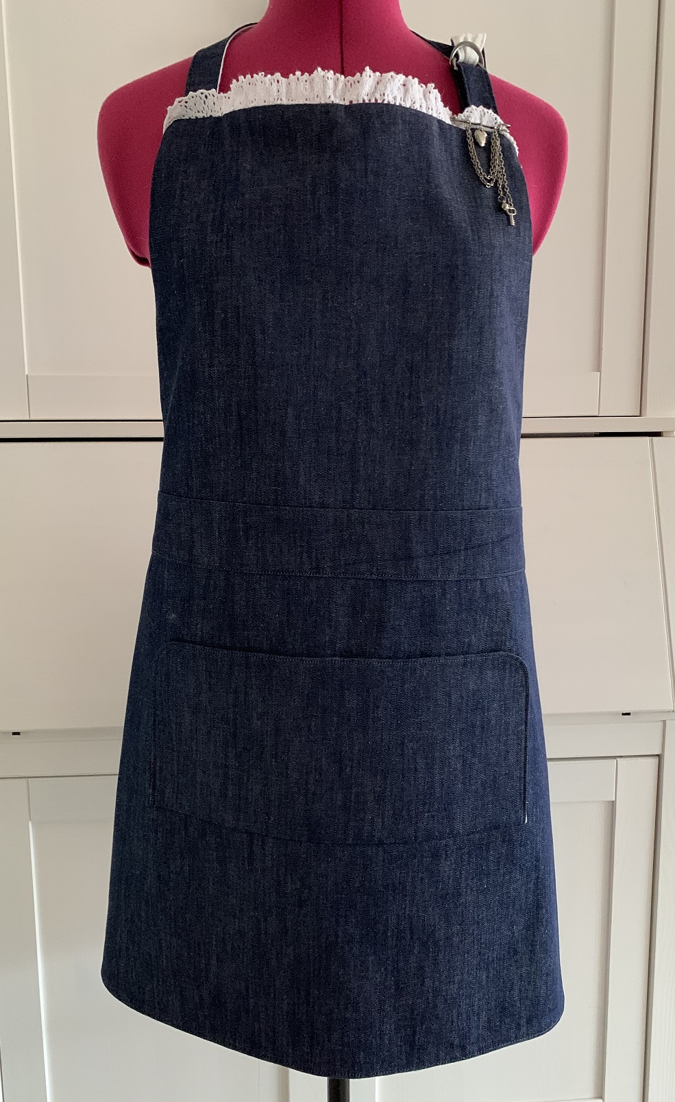 Et voilà ! Après quelques heures de galère et j’ai enfin réussi à coudre ce tablier à temps pour l’offrir à mon amie. Le voici sur le mannequin puis porté pour de vrai :