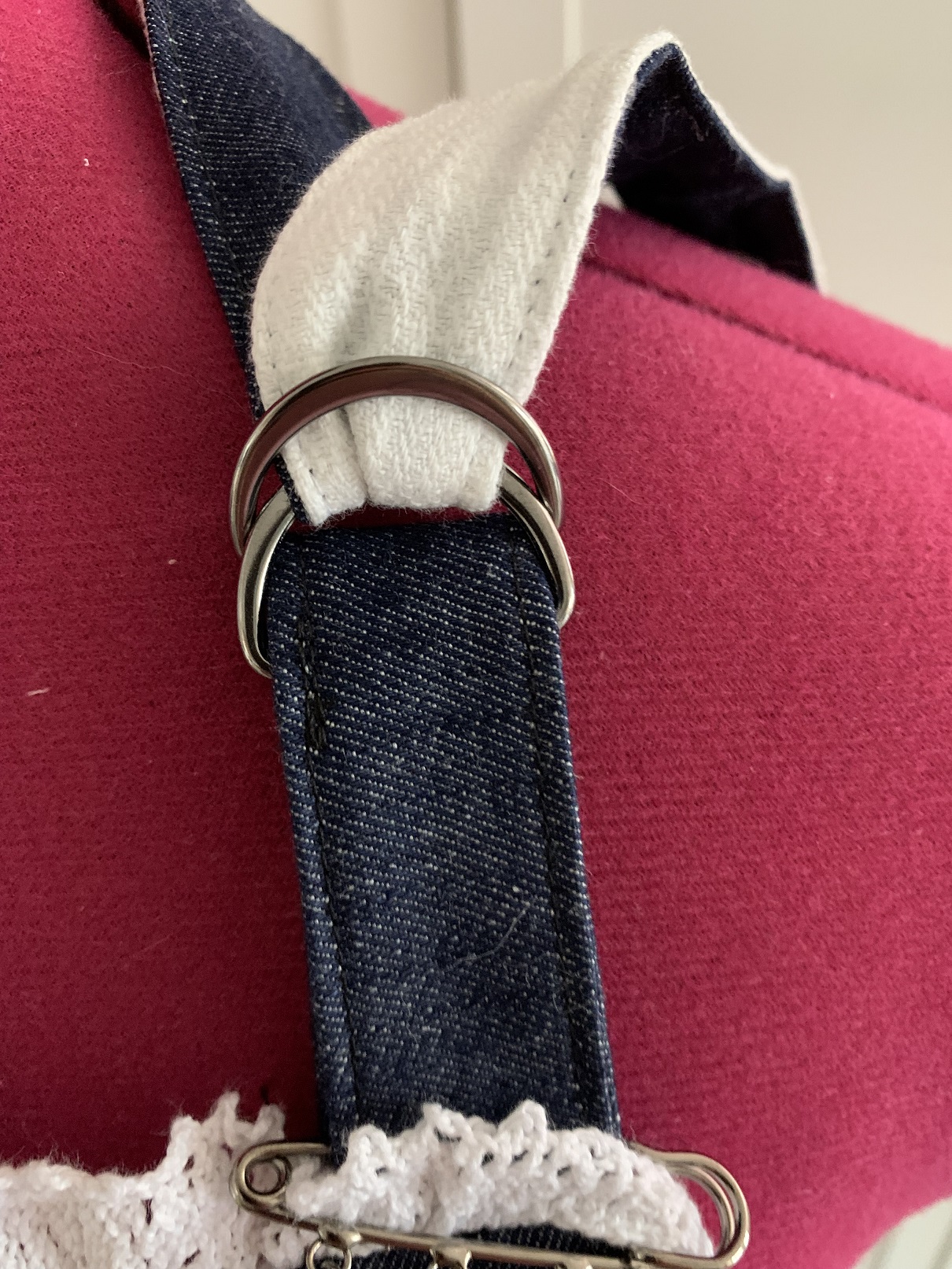 Je l’ai ensuite surpiquée puis placée à 1 cm du bord gauche en haut de la bavette, en n’oubliant pas de rajouter les deux anneaux qui permettront de régler la longueur du lien autour du cou. J’ai procédé de la même façon avec ce dernier : cousu endroit contre endroit, retourné puis placé à 1 c du bord droit en haut de la bavette. A cette étape, j’ai décidé de rajouter un galon de dentelle sur le haut de la bavette ; il a donc fallu que j’enlève les deux pièces précédentes, que je place la dentelle et que je remette la patte d’attache et le lien à nouer. Ensuite j’ai placé la doublure endroit contre endroit; On se retrouve avec ça :