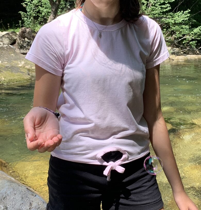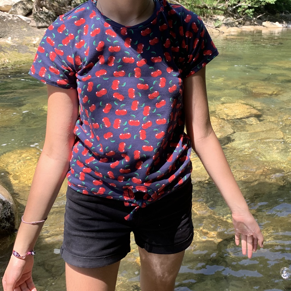 Il s’agit d’un tee-shirt à manches courtes tout simple mais avec des nouettes devant, un détail qui m’obsède en ce moment, allez savoir pourquoi … ! Il n’y a pas grand chose à dire à propos de ce basique qui se coud très rapidement. Le seul détail un peu technique est la pose des bandes en bas du tee-shirt. On commence par poser la bande de taille comme pour un tee-shirt classique sauf qu’on s’arrête aux bords de l’arrondi du devant. Il n’est pas nécessaire de faire des finitions puisqu’on va venir coudre ensuite la bande de nouettes sur cet arrondi. On commence à la poser comme un biais, en deux temps. Un fois que l’arrondi est cousu on termine de coudre soit en surpiquant les longueurs, soit en les cousant endroit contre endroit puis en retournant.