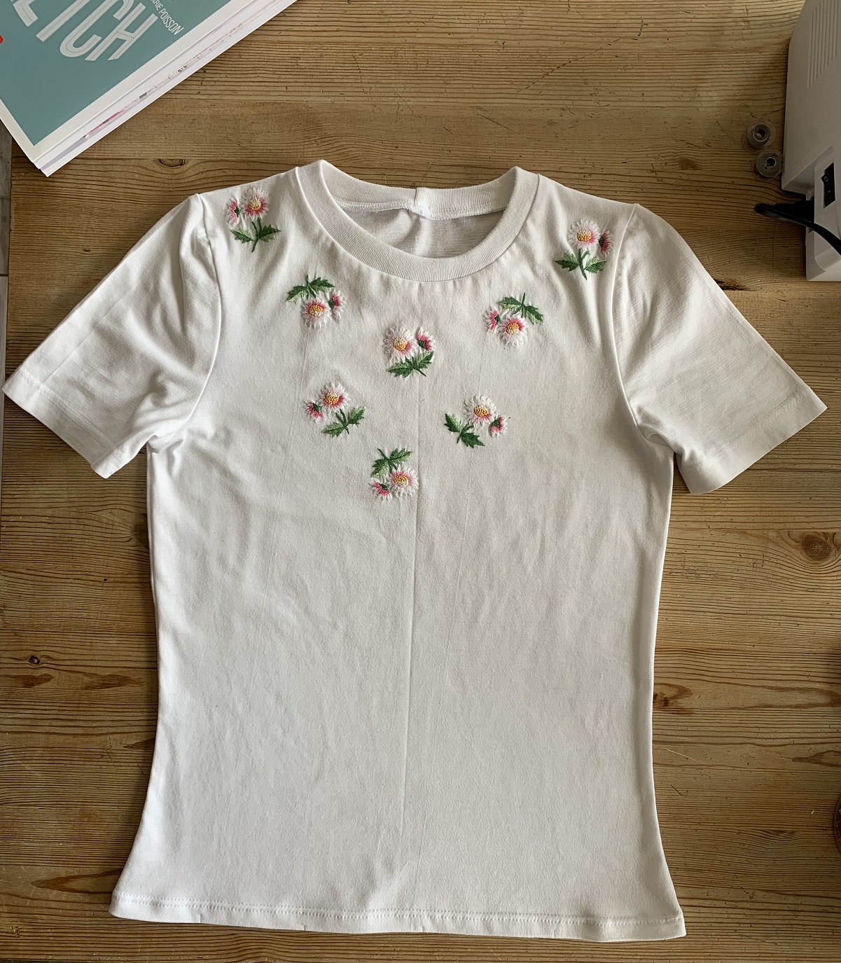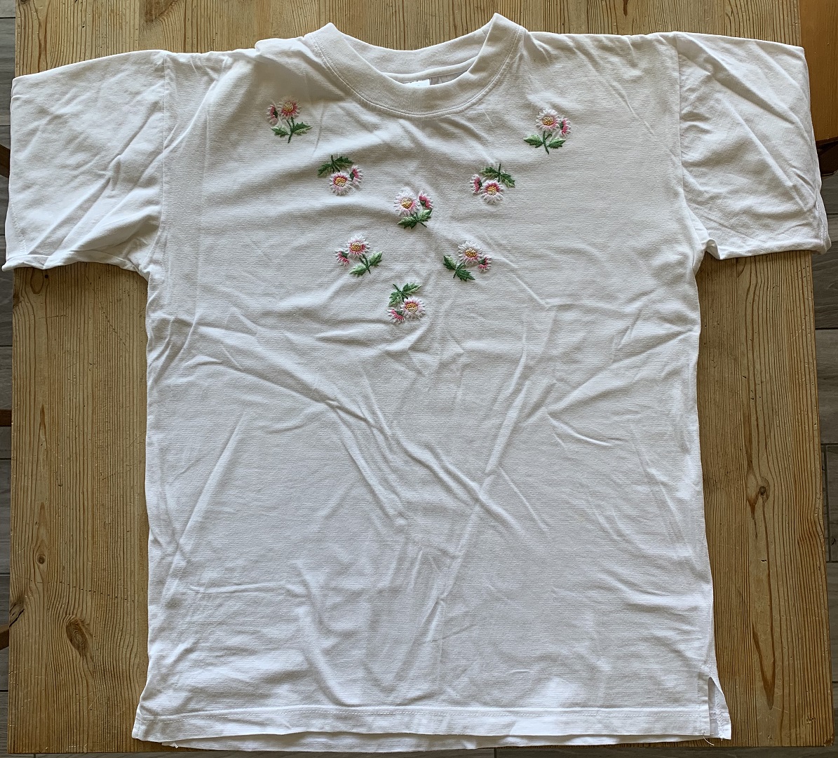 J’ai récemment récupéré beaucoup de vêtements en très bon état mais pas forcément dans la bonne taille pour mes proches ou moi. Il y avait notamment ce tee-shirt en taille 40 et brodé main et j’ai tout de suite pensé à le recouper en taille 34 pour ma mère.