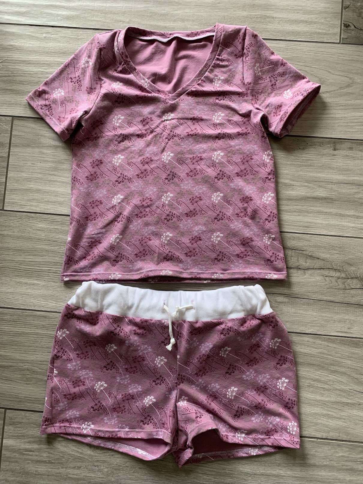 J’ai choisi de coudre le col en V et le résultat est waouh ! Je suis sûre et certaine d’en recoudre d’autres !! J’ai également élargi le tee-shirt en traçant une ligne droite de l’aisselle à la taille car je n’aime pas être engoncée dans mes fringues, et encore moins dans un pyjama.