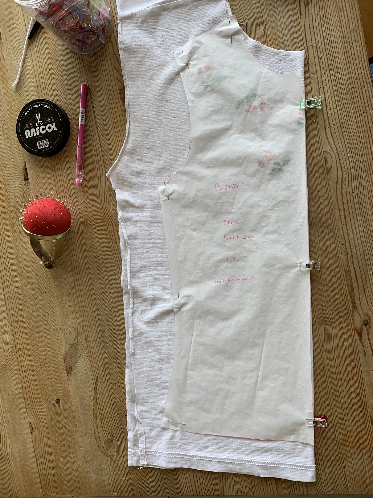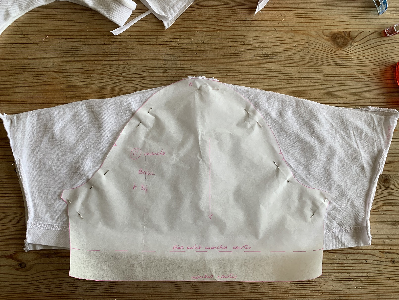 J’ai donc commencé par couper les différentes pièces qui composent ce tee-shirt, en poussant Chassistante n.1 d’abord bien sûr. Pour ce projet, j’ai pu couper car on passe du 40 au 34 et il y a donc de la marge. Il aurait fallu plutôt découdre si la marge avait été moins importante. Ensuite j’ai posé les pièces du Briac en taille 34 sur chaque pièce et j’ai redécoupé.
