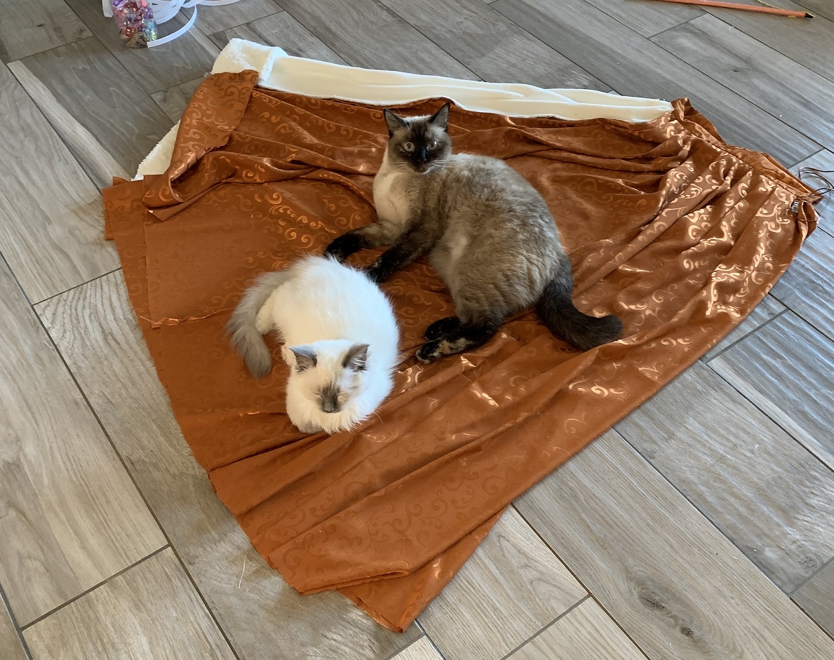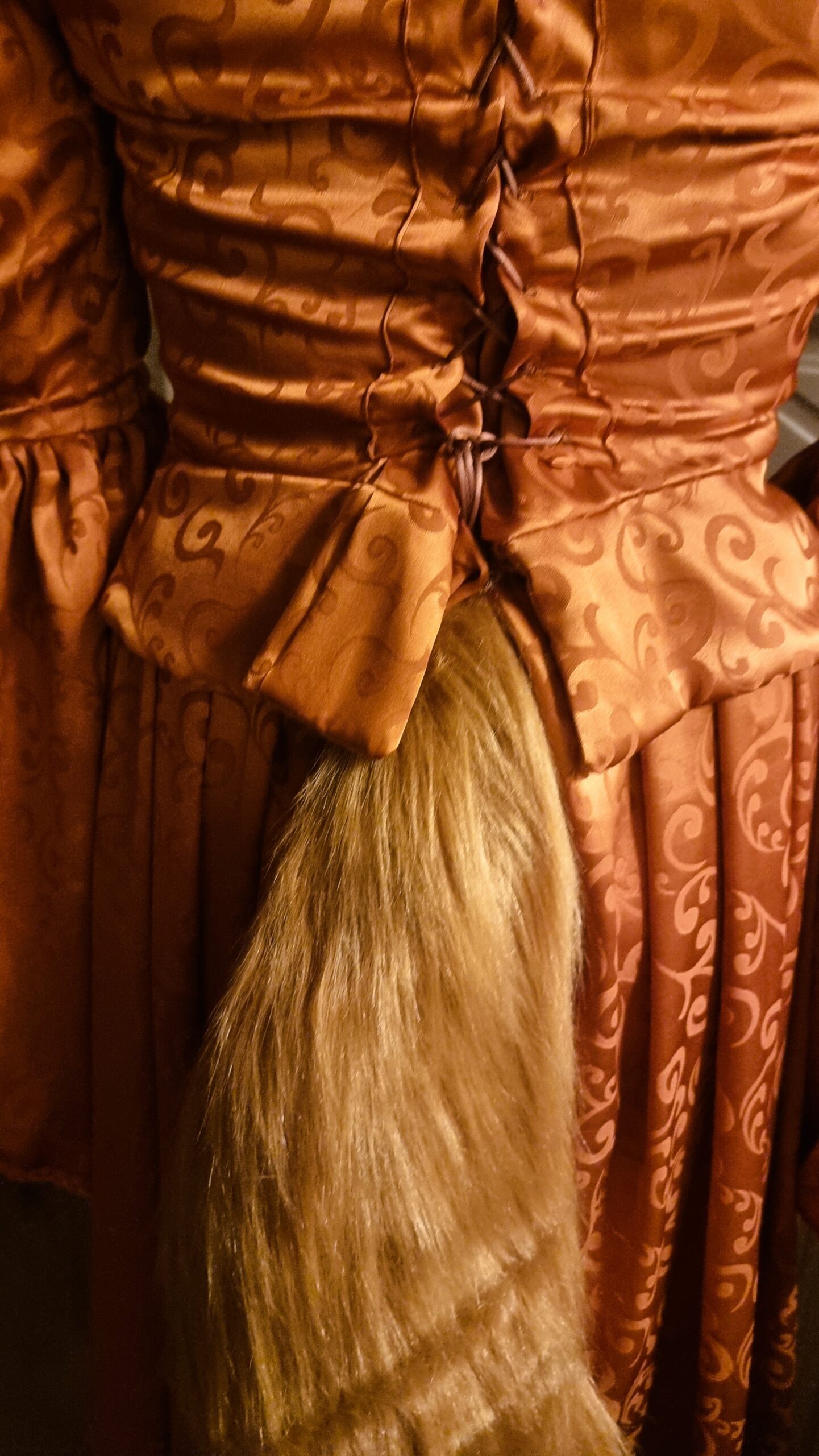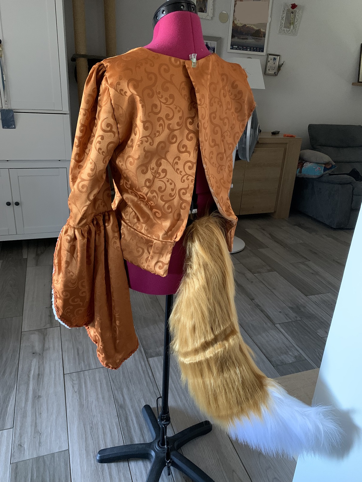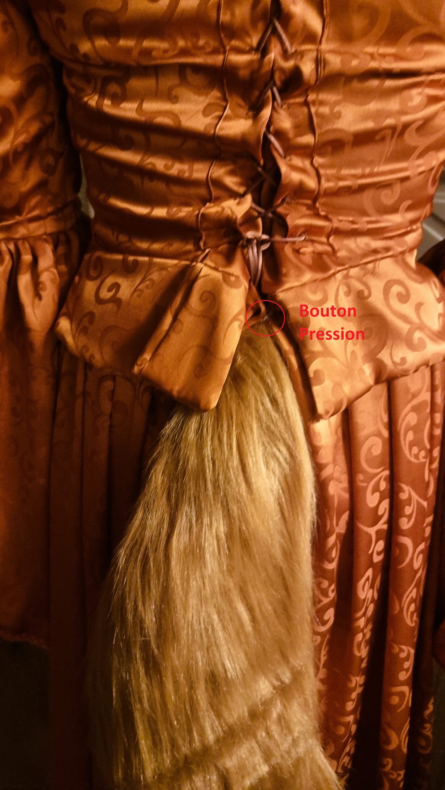 Évidemment, je n’ai pas cousu la jupe jusqu’en haut pour pouvoir faire passer la queue. Le patron est très pratique car il comprend une patte de boutonnage (pression) pour refermer le haut de la jupe, sous la ceinture, ce qui m’a permis de dissimuler l’ouverture créée par le poids de la queue. Ce n’est peut-être pas très clair, il faudra que vous me croyiez sur parole !