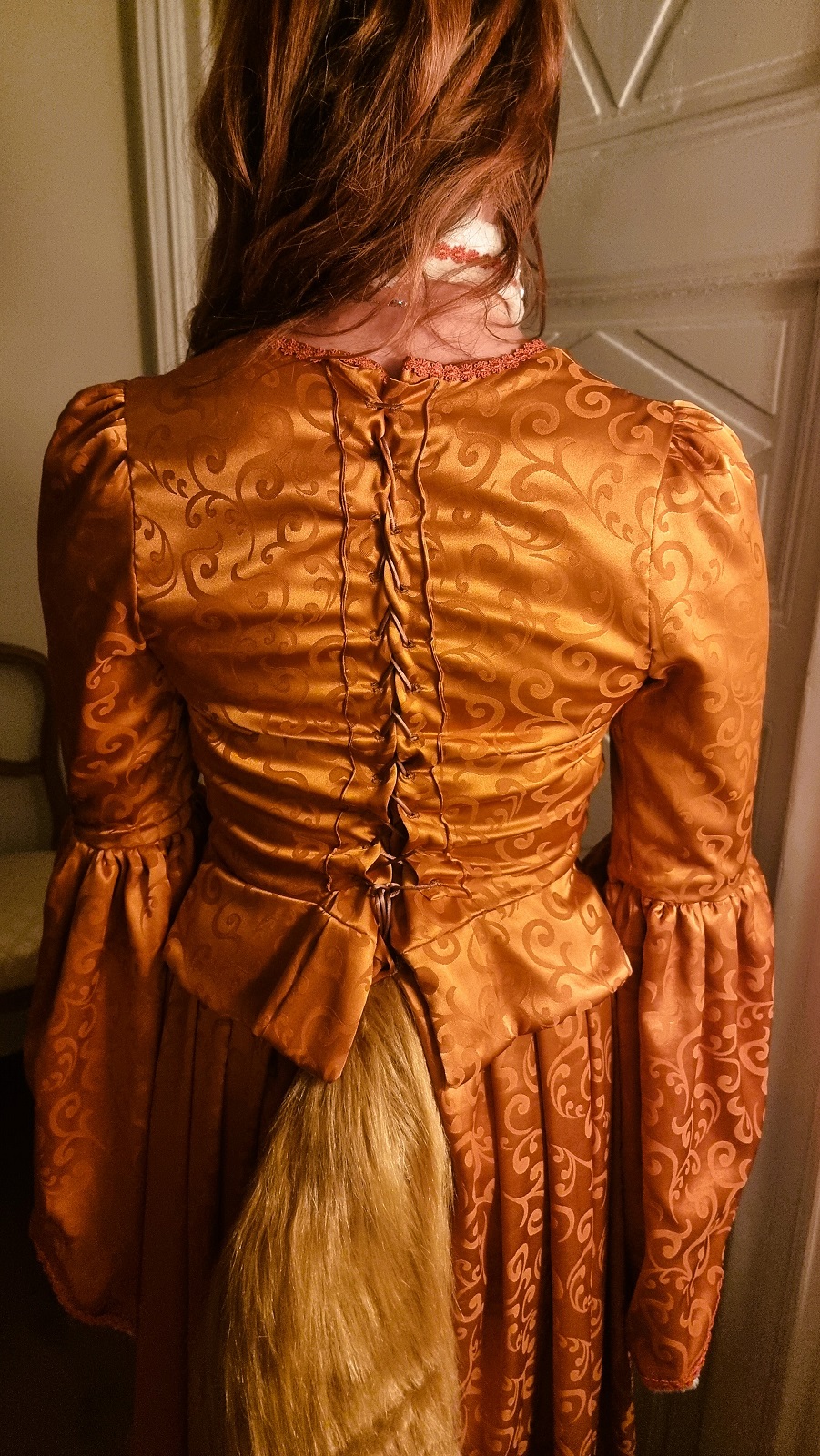 A cette étape j’ai commencé à faire les premiers essayages ; j’aurais dû essayer bien plus tôt (et même faire une toile …) car le décolleté était trop plongeant pour moi et le corsage bien trop large. Qu’à cela ne tienne, j’ai décidé d’incarner mon personnage à fond et de ruser ! Pour le décolleté trop profond, j’ai simplement resserré légèrement le tissu en cousant à la main le galon de fleur. Quant à la largeur du corsage, j’ai reculé de 9 cm chaque patte de boutonnage au dos en repliant le tissu en trop à l’intérieur et j’ai ainsi obtenu un corsage parfaitement à mes mesures. J’ai choisi de ne pas poser des œillets pour le laçage mais plutôt de faire des boutonnières rondes.