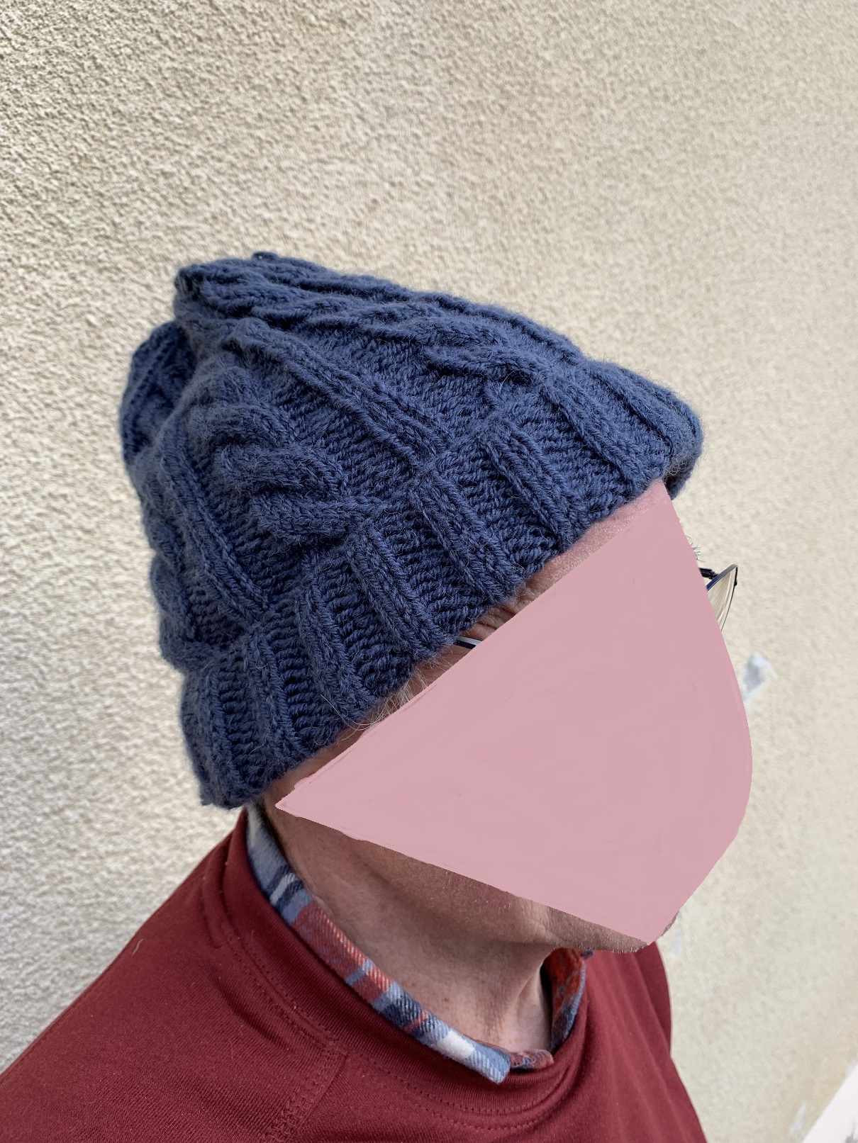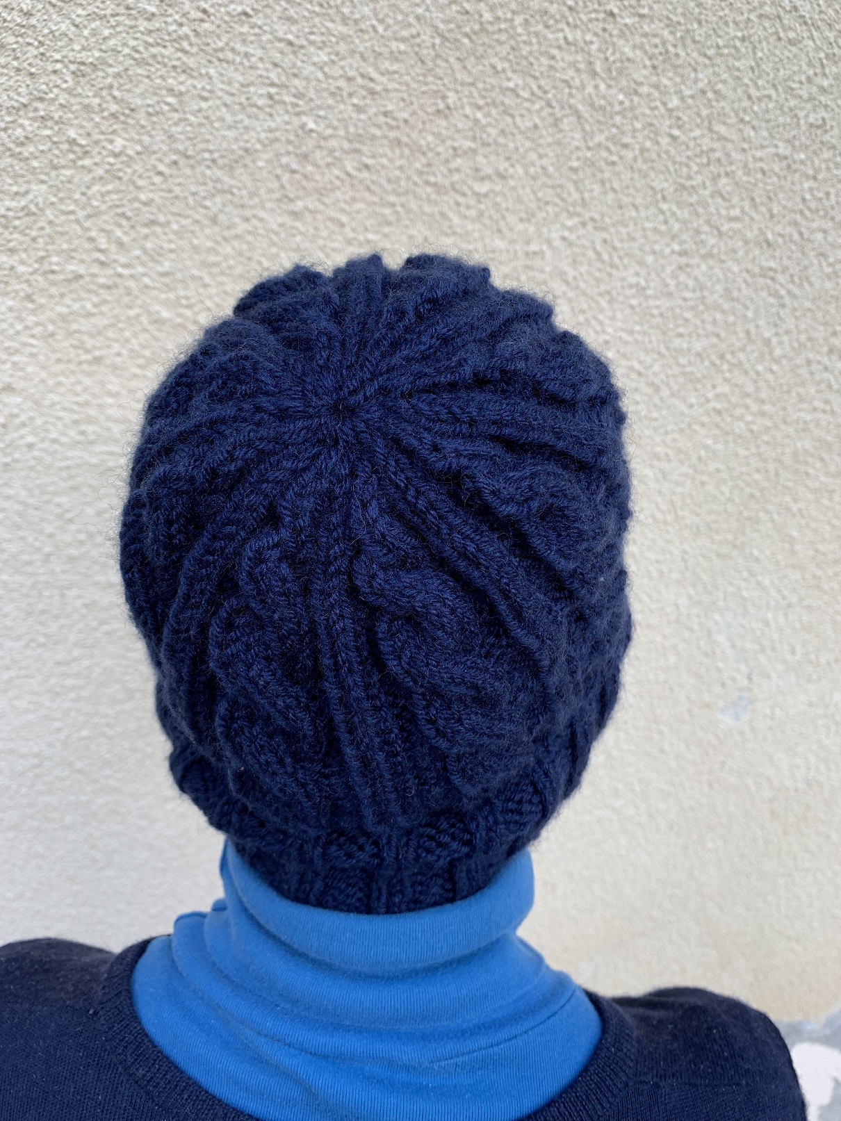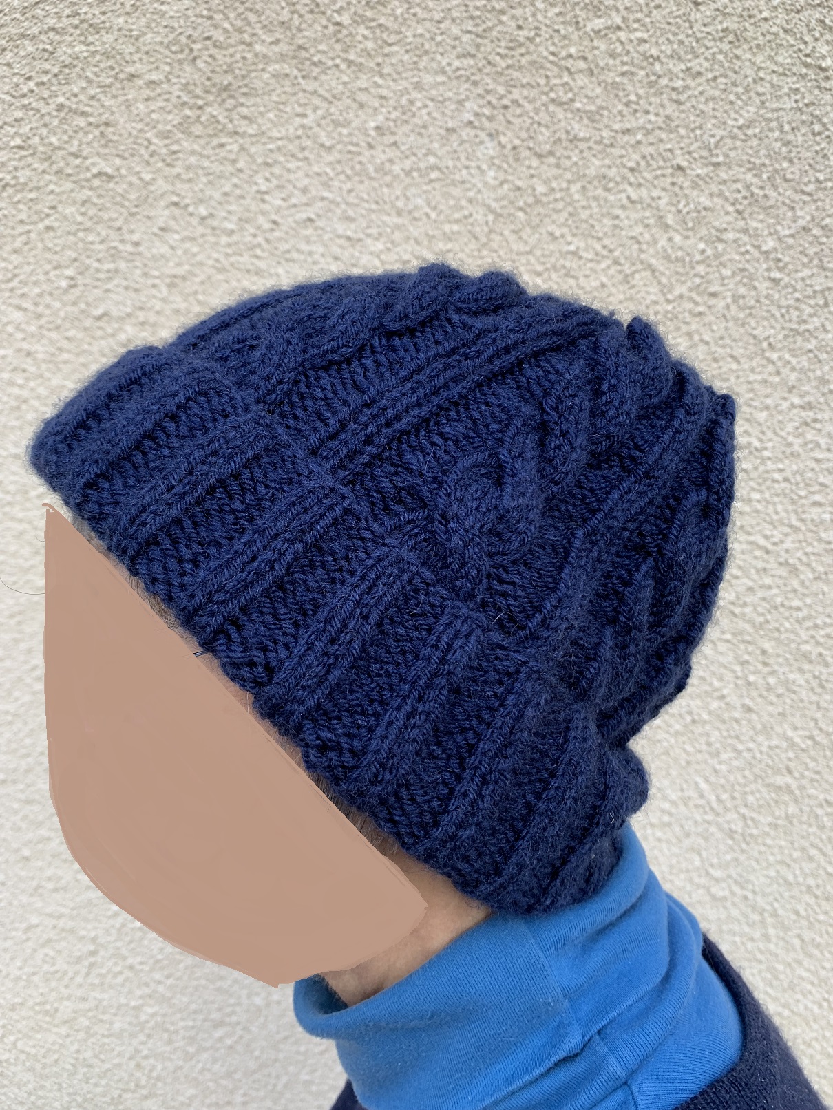 Voici le bonnet en coloris minuit que ma mère porte près de la tête :