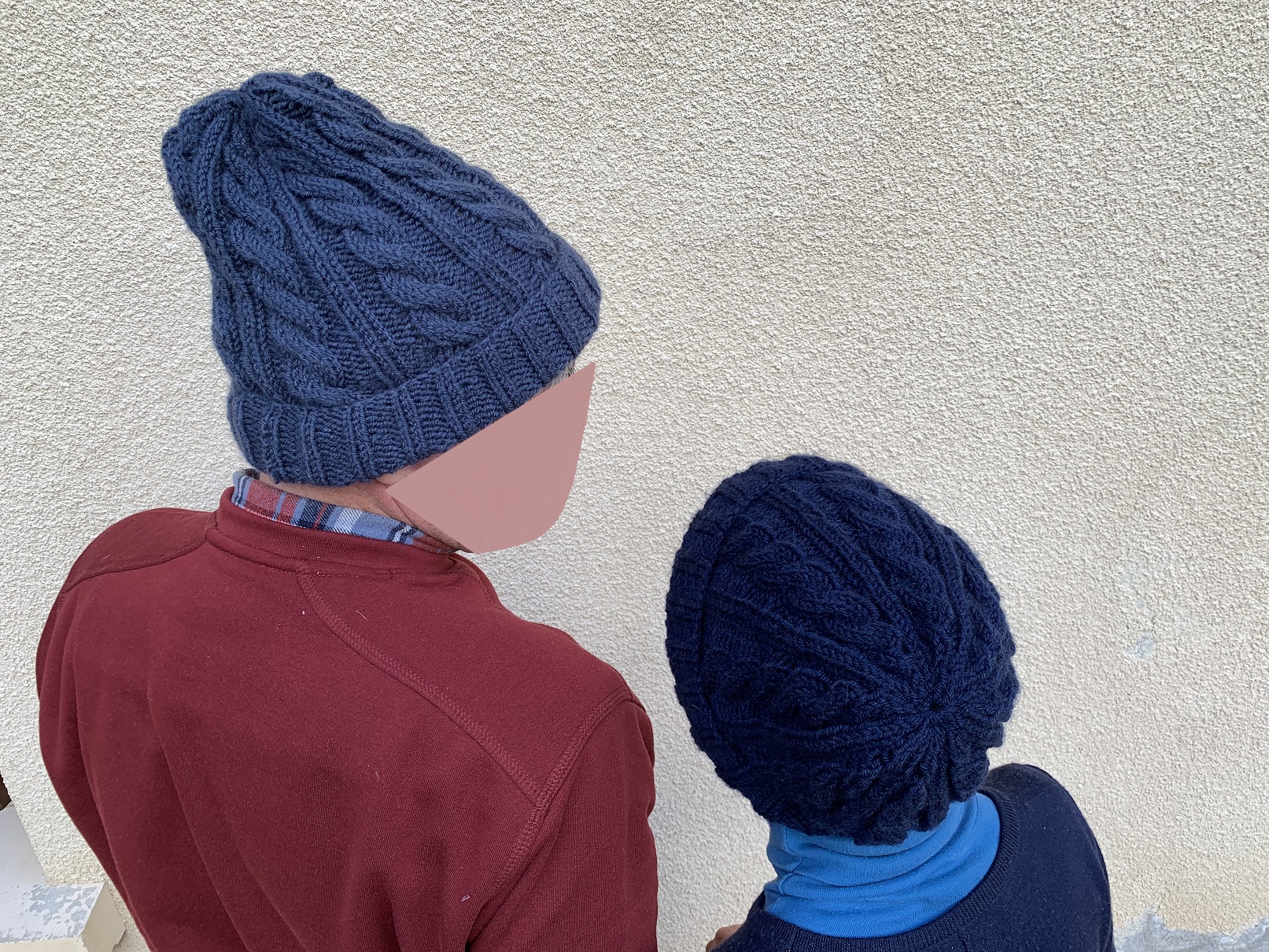 J’ai utilisé de la laine Sport + de chez Bergère de France dans les coloris minuit et cosmos. Je n’ai malheureusement pas de photo du premier bonnet qui a été offert l’année dernière. J’ai suivi scrupuleusement les indications du patron et j’ai tricoté les côtes en aiguilles n°4 et le reste du bonnet en n°5. Le patron est très clair et comporte des explications écrites et non sous forme de diagramme. J’ai utilisé deux pelotes de 50g pour chacun.
