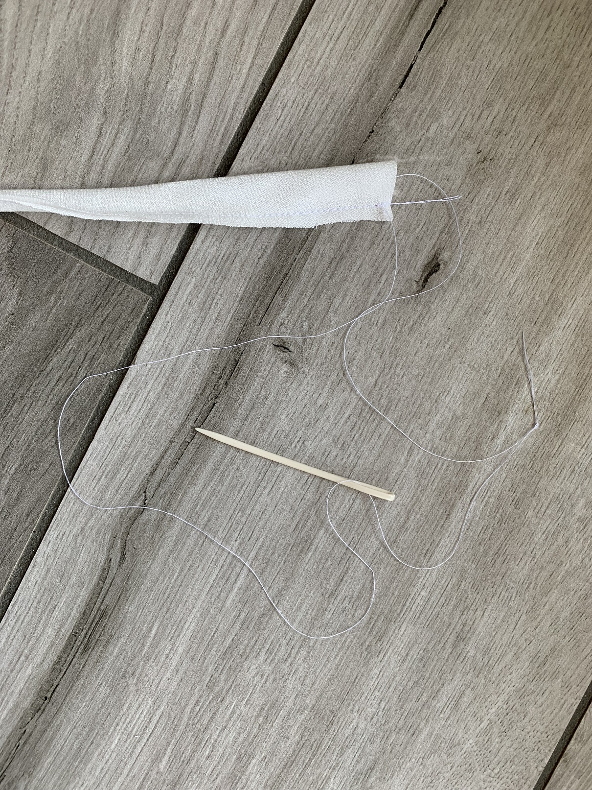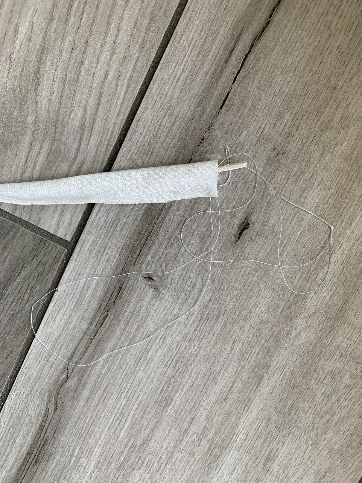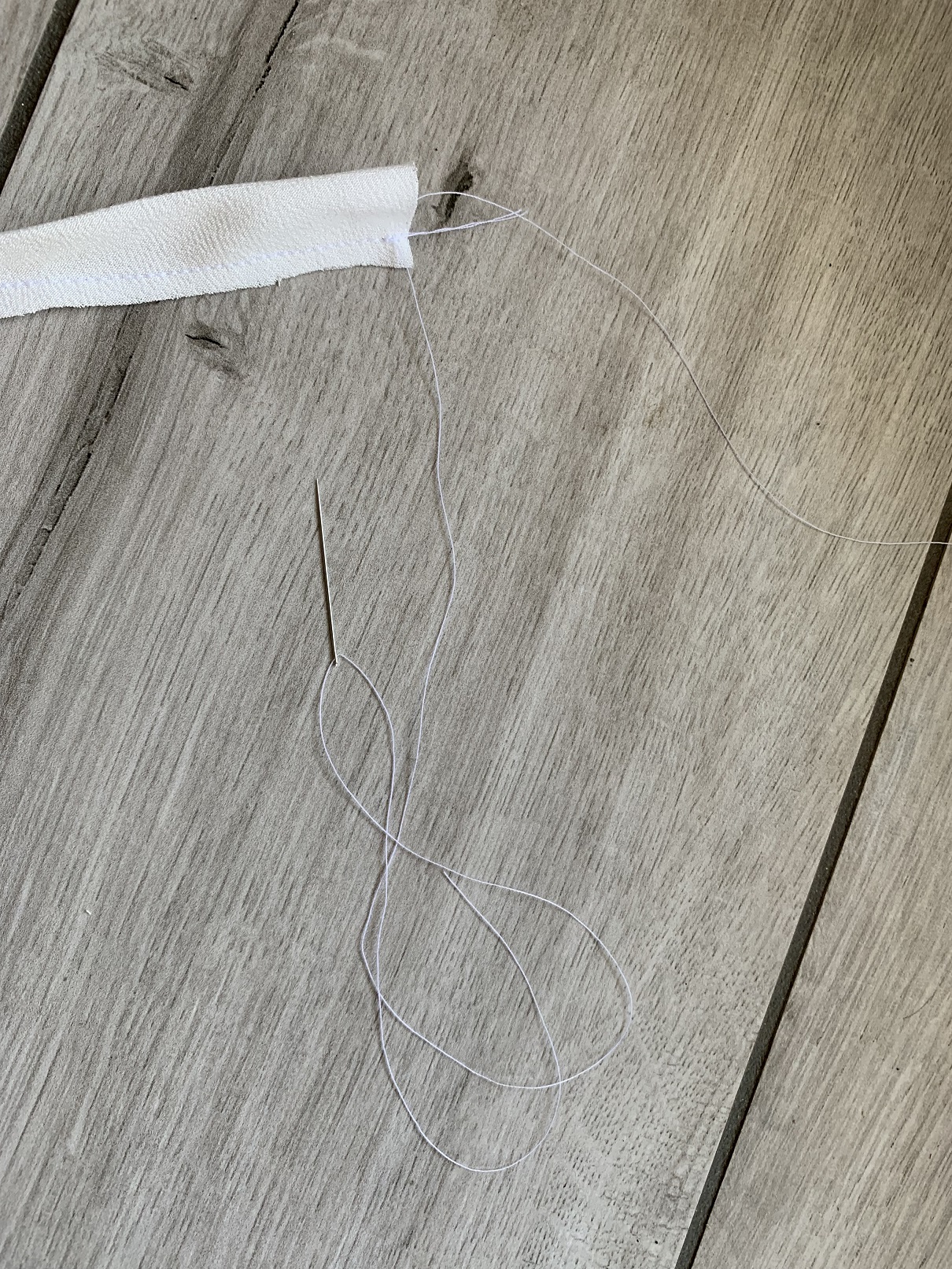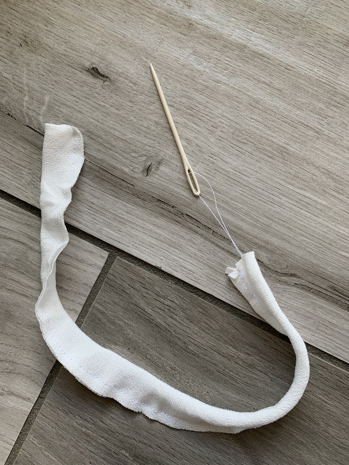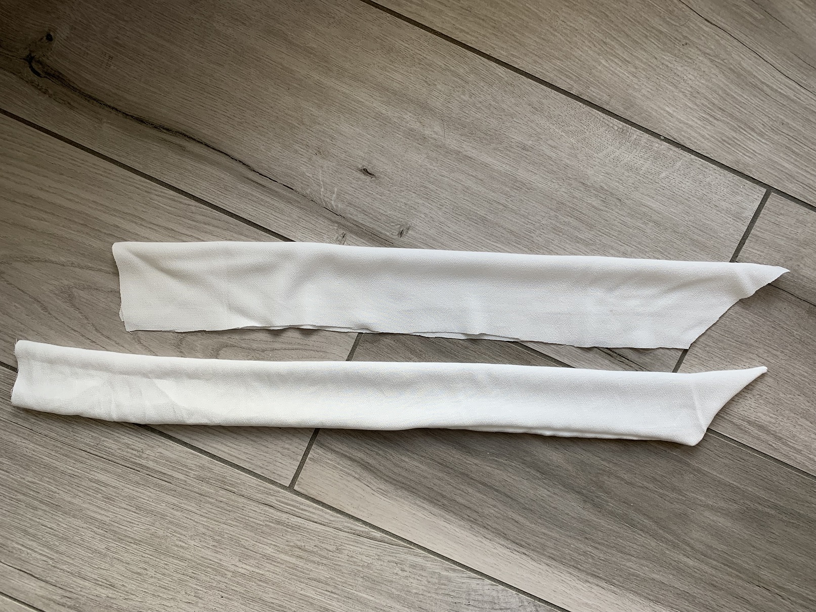 On commence à coudre les nœuds, qui sont deux simples bandes à coudre endroit contre endroit et à retourner. J’ai suivi le patron dans un premier temps mais après avoir essayé de passé une bande dans la coulisse, j’ai trouvé que le boudin obtenu était trop rigide alors j’ai recoupé et réduit la largeur des bandes à 3,5 cm. Puis on fait les ourlets des deux devants et on coud la coulisse.