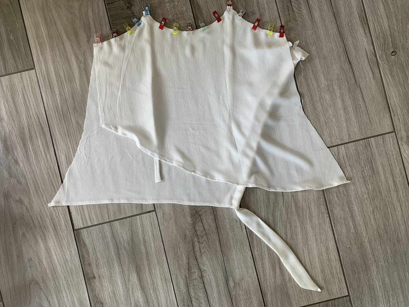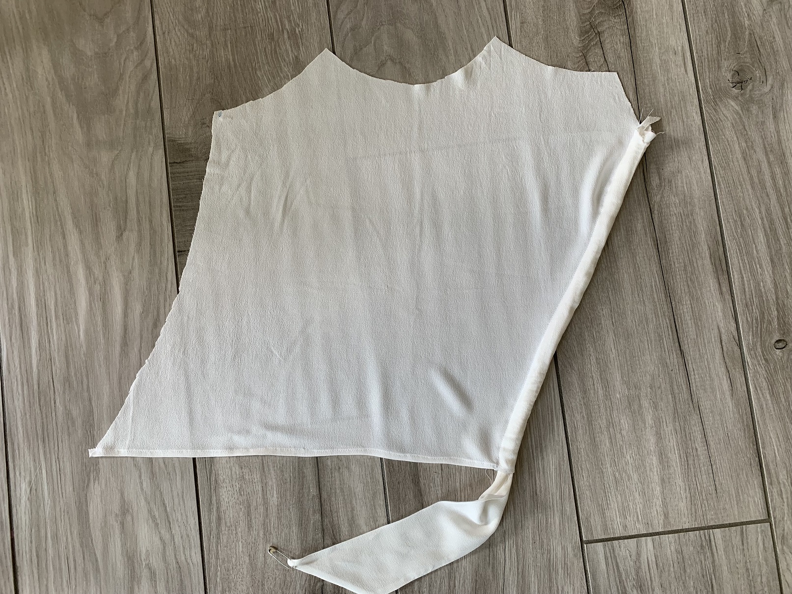 On est presque à la fin ! une fois que l’encolure est cousue, on retourne le lower front derrière le upper front et on obtient la pièce devant. Il reste à faire un ourlet en haut et en bas de la pièce dos, sans oublier de fixer la seconde bande pour le nœud à l’endroit où on a fait un cran, toujours sur la pièce dos.