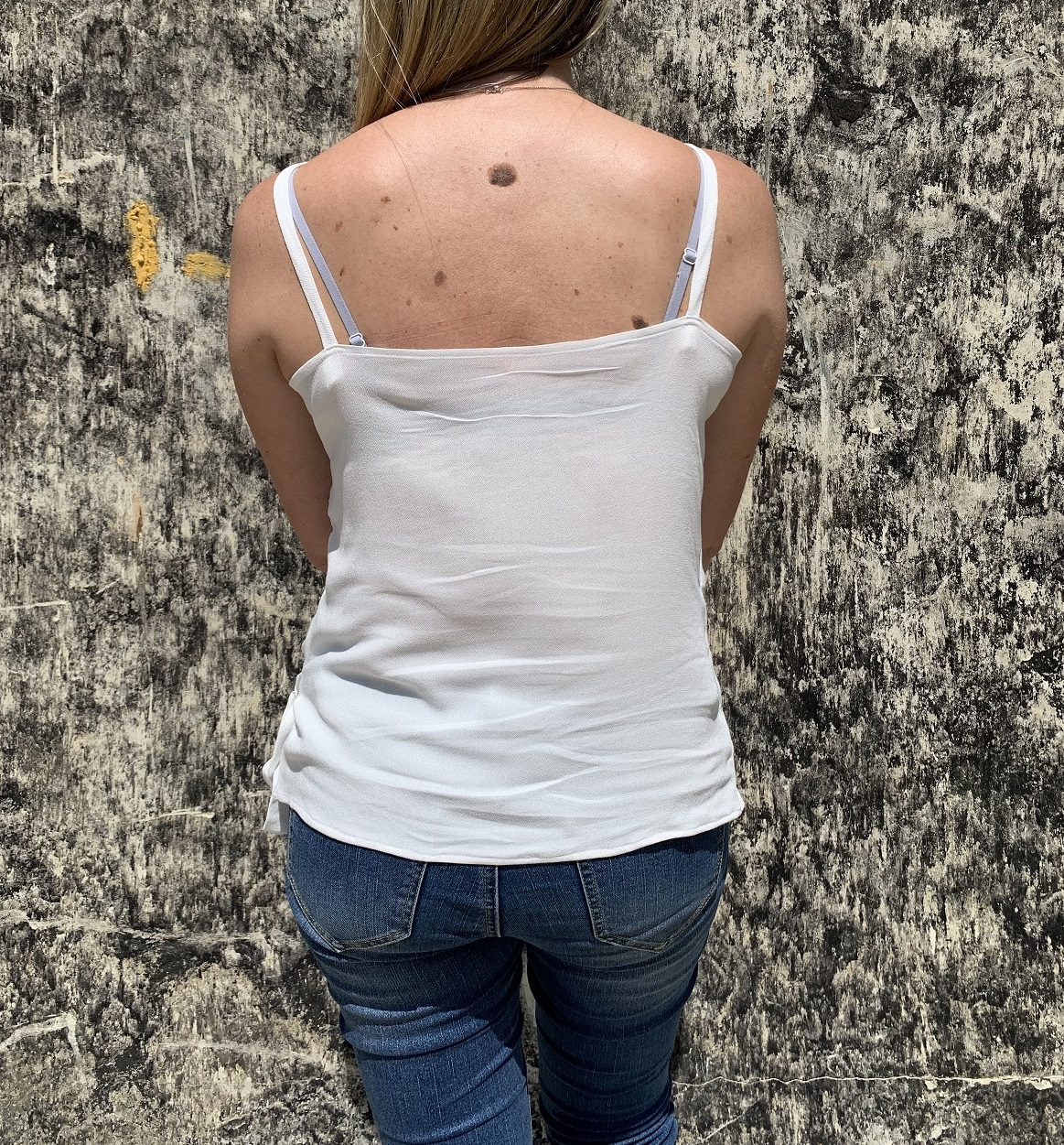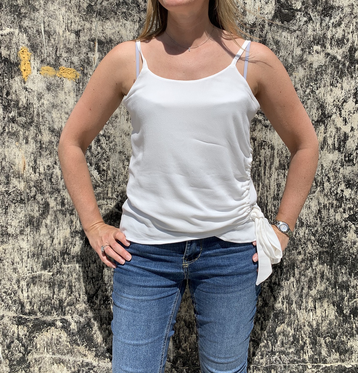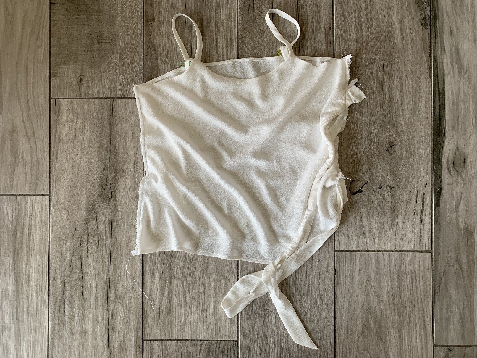 Je ne suis pas satisfaite de ce résultat car aujourd’hui mes bretelles ont tendance à roulotter. Il est donc préférable de former ces bretelles en les pliant à la façon d’un biais et en surpiquant les longueurs. Je ferai plutôt de cette façon si je devais refaire ce top.